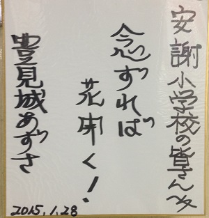 あずささんが、安謝っこに向けて贈ってくださった言葉です。現在、校長室の前に飾られています。ご来校の際には、ぜひご覧下さい。