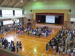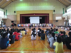 「銘苅子」のストーリーを聞いて、学校の歴史を感じながら、全校児童で、校歌を歌いました。