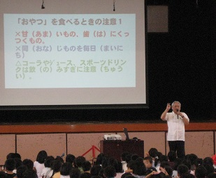 食育朝会では、校長先生が「おやつ」の食べ方についてお話ししました。