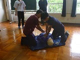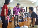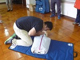 いよいよ水泳学習が始まるということで、お隣の複合施設にある日本赤十字社の新崎さんと下地さんに講師として来て頂き、救急救命法の研修を行いました。