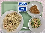 今日の給食の献立は、スパゲティージェノベーゼ、かぼちゃフライ、ブロッコリーサラダ、牛乳でした。