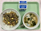 今日の給食の献立は、もずく丼、かき玉汁、牛乳でした。