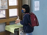 【登校時の様子①】    【登校時の様子②】  【朝の活動の様子】   【教室に入室前に手の消毒】    【教室の様子】     【全校朝会、校長先生のお話】