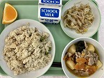今日の給食の献立は、煮つけ、おかか和え、タケノコごはん、きよみオレンジ、牛乳でした。