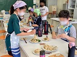 昨日の5年生に続いて、今日は6年1組が3・4校時、2組が5・6校時に調理実習を行いました。野菜を切る人、炒める人など役割分担をしっかり決め、今年度最初で最後の調理実習を友だち協力しながら楽しんでいました。