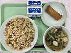 今日の給食の献立は、中華風炊き込みごはん、春巻き、つくね入り中華スープ、牛乳でした。