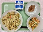 今日の給食の献立は、メキシカンライス、チキンのマーマレード焼き、人参とキャベツのサラダ、牛乳でした。