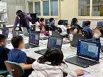 3年1組はスクラッチというソフトを使ってキャラクターをプログラム通りに動かす活動に取り組んでいました。2組は「家のパソコンで」という題材文を使ってインターネット等の利用の仕方について考えていました。