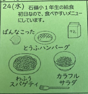 初めての給食なので、栄養士さんが食べやすいメニューを考えてくださったようです。