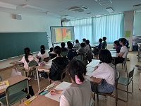 6年生が石嶺町伝統エイサー会の方を講師にお招きして地域のエイサーのお話を聞きました。