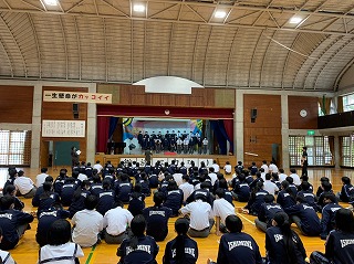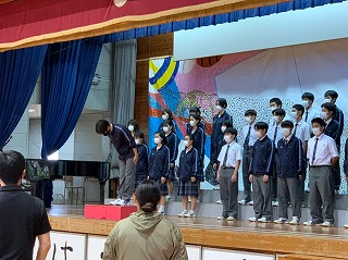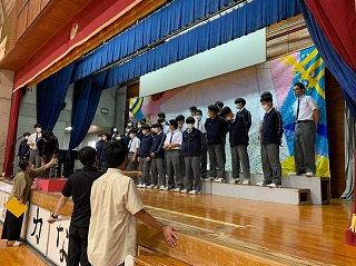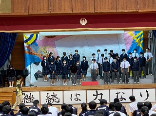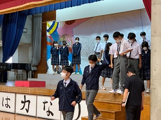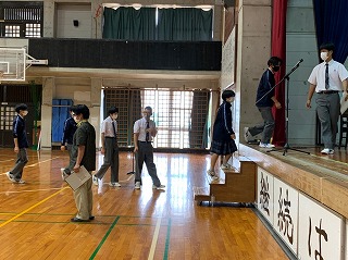 6校時、3年生は体育館で11日に開催される校内合唱コンクールのリハーサルを舞台で行いました。今日は入退場と立ち位置の確認でしたが、本番はステージマナーとして、入退場や立ち方まで採点の対象となることから、このようなリハーサルが必要です。しかも3年ぶりということなので3年生も初めての経験です。