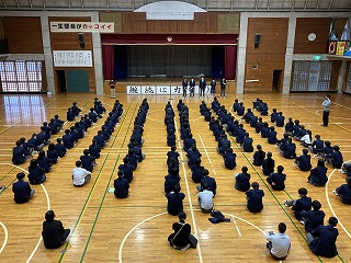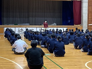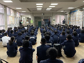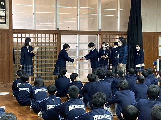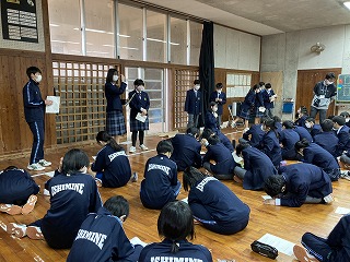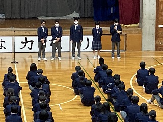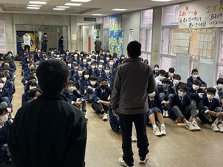 体育館の3年生は、後期の学年委員さんが一人ずつ2学期の振り返りを発表していました。一人一人の話からは、3年生として仲間と共に成長してきたことがうかがえます。学年主任の桃原先生からは、「立つ鳥跡を濁さず」の言葉の意味が伝えられ、卒業に向けての心がまえについて、みんなで考えました。