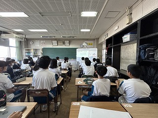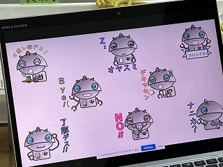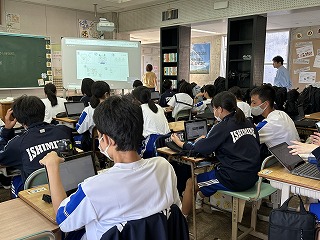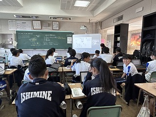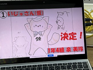放送朝会でスタートして、校長あいさつの後、キャリア教育担当の有晃先生から嶺中マスコットキャラクター応募作品の紹介と、タブレットを活用して人気投票が行われ、初代石嶺中学校のマスコットキャラクターが決定しました!