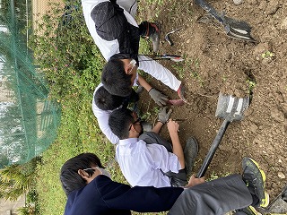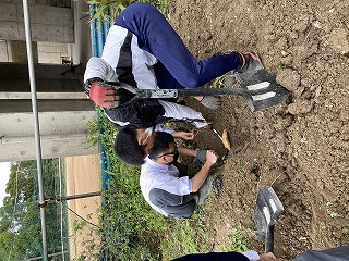 土の中から宝を掘り当てる感覚で、見つけた時は大きな声が上がります。途中で切れたりしないように丁寧に掘り出す作業は根気がいりますが、大きい芋を見つけるたびに「今日の一番!」と記録を更新していきました。収穫の喜びは大きいです。私も夢中になって時間を忘れてしまいそうでした。