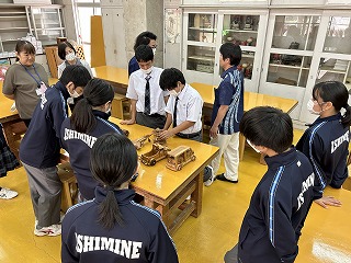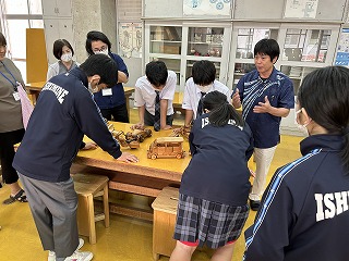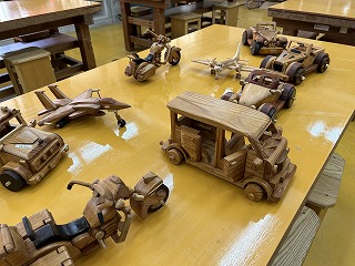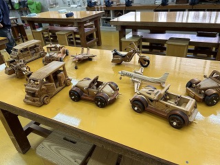 クラシックカーやジェット機、バイクなど、どれも精密でパーツが動き、小物入れやオルゴールがついていたり、一工夫も二工夫もある木工作品でした。「こんなの作れるの?」と生徒も興味深々でした。