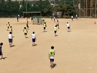 グランドから元気な声が聞こえています。3年生男子はサッカーの授業、女子は体育館でバスケットボールのゲームをしていました。
