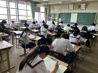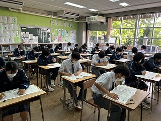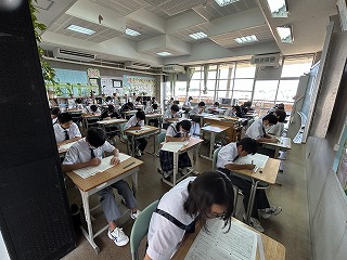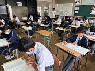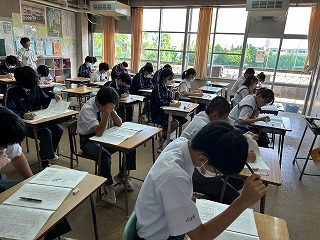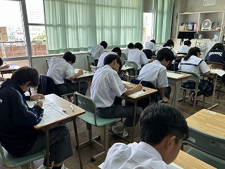 1年生にとっては初めての定期テストになります。朝登校してからは、教科書やノートで最終チェックをしたり、問題を出し合ったりする姿が見られました。
