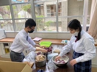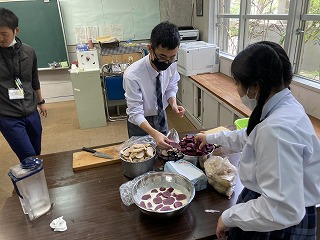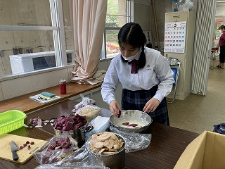 石嶺中学校の畑で収穫した2種類の芋で天ぷら作りをしていました。