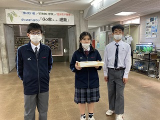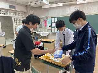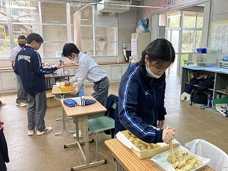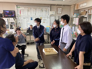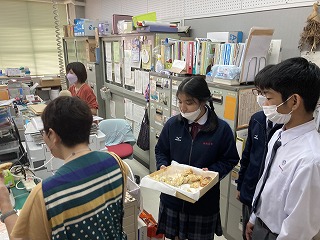 職員室や事務室に持って行って、試食してもらいました。自分たちで収穫した芋ですと説明していました。先生方に「できたてでとても美味しい」と喜んでもらえて、すごく嬉しそうでした!