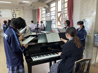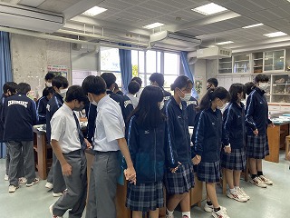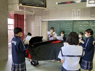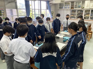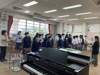 2年5組さんは合唱コンクールに向けて元気いっぱい校歌を歌ったあと、パートに分かれて練習をしていました。担任の優子先生も一緒になって練習の様子を見ていました。少しずつ仕上がっていくのが楽しみです。2年1組さんは理科の時間に輪になって手をつないでいました。何をしているのかというと、感覚器官で受け取った刺激がどのように伝わるかタイムを計測する実験をしています。
