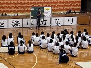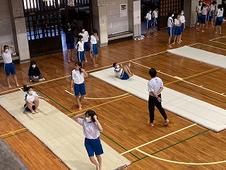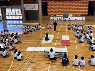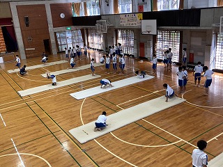 1年1組~3組さんの体育は器械運動で前転や後転の練習をしていました。宗矢先生の模範演技を見て、自分の動きに生かせるように練習しています。マット運動は得意不得意があるかもしれませんが、少しでも上達したら嬉しいですよね。アドバイスをし合って頑張ってほしいです。