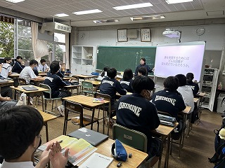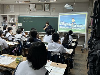 3年生の教材は「風に立つライオン」でした。まず夢についてきかれると、「漫画家」「動物園の飼育係」など具体的な答えが返ってきました。「では、夢を実現するために、どんな困難が待ち受けていると思いますか?」と問いかけられ、「努力しないといけないから怠惰な自分に打ち勝つ」と答える生徒がいました。いろいろな考え方があることに気づいて、自分はどうだろう?と自問自答することもとても大切ですね。2年生、1年生も担任の先生の範読を真剣に聞いたり、動画を見ながら説明を聞いたり、毎時間の道徳の授業を大切にしていこうという姿がありました。