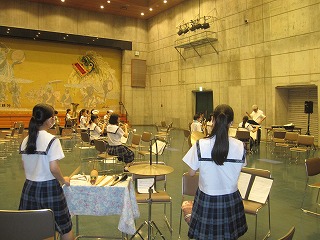マーチなので聞いていてワクワクしてくる軽快なテンポ、16名とは思えない音色と厚み、素晴らしい!石嶺中学校の吹奏楽部のレベルの高さがうかがえました。2曲目はスーザス・ホリデイ「雷神」これはノリのいいサンバでパーカッションの皆さんも頑張っていました。あっという間の演奏時間でした。吹奏楽部の皆さん、素晴らしい演奏でした!写真撮影は禁止なので会場の様子はご覧いただけませんが、会場での練習の模様です。