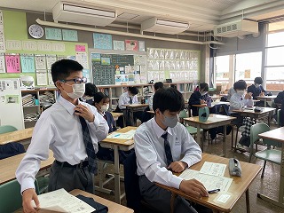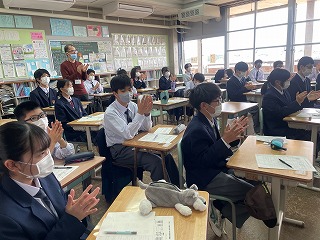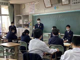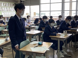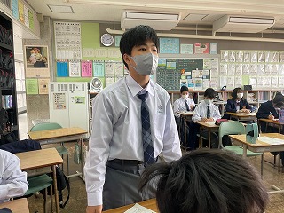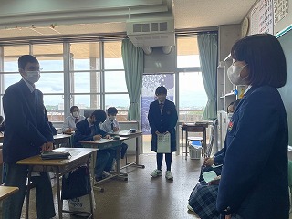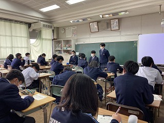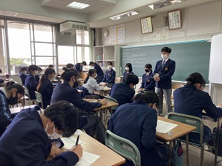 3日(金)の総合の時間で、1年生は推薦内定者の先輩から学ぶ進路学習会を行いました。それぞれの学級に4名の3年生が招かれて、自身の進路選択や受験勉強について体験を話してもらいました。