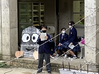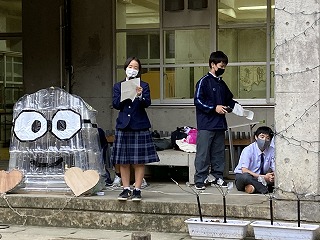 生徒会総務の高橋大翔さんが司会をし点灯式が始まりました。放課後ですがたくさんの生徒の皆さんが集まりました。イルミネーション部を代表して牧優里さんがあいさつをしてくれました。その中に、昨年修学旅行で関西に行けなかった先輩方のためにミニオンのイルミネーションで楽しんでもらえたらと思い頑張って作ったとのことです。