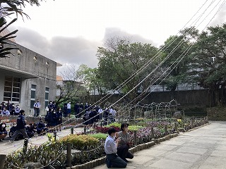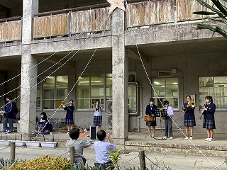 吹奏楽部のファンファーレが響き、「点灯!」のかけ声で一斉に光が点滅!!!・・・まだ外は明るく、キラキラ感を満喫!まではいきませんが嬉しそうな嶺中生の笑顔がたくさんキラキラしていました。光のアーチをくぐったらきっと幸せがおとずれます!今日も最高でした石嶺中!