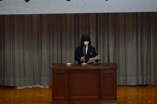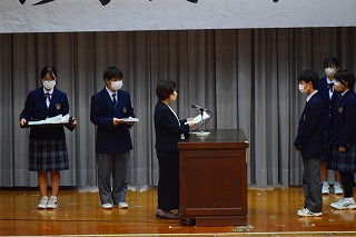 生徒代表あいさつは、1学年上間妃立さん、2学年平田静香さんでした。上間さんは「2学年に進級しても新一年生のお手本となれるように、直すべきところは直していきたい」と語り、平田さんは「受験生としてだけではなく、最後の中学校生活を全力で楽しみ、最強で最高の名門石嶺中学校の伝統を築いていきたい」と語ってくれました。