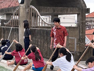 今朝で4日目となったハーリー練習。この一週間でみんな上達しています!監督の伊禮達郎先生を中心に、男子監督宗矢先生、女子監督七海先生、それを支えるたくさんの先生方に見守られ、毎日朝練頑張っています。今週末はそれぞれの部活で大会も控えているので、腕がパンパンにならないように、2分ごとに交代して漕ぐ練習をしました。