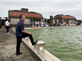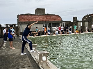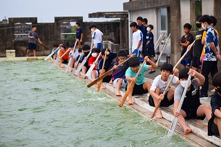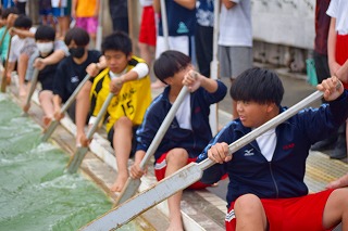 総監督の教頭先生から、女子は漕ぐリズムがそろっていて上手だと褒められました。男子の代わりに上手な女子をメンバーチェンジして入れることはできるけど、男子が女子の船に乗ることはできないと教頭先生から説明があると「なんでよ~!」と男子から笑いとともに抗議の声があがりました。「男子も女子に負けずに頑張ってよ!」と激励されました。30日の海上での練習と合わせて本番まであと6回。みんなで優勝目指して頑張りましょう!!!
