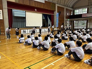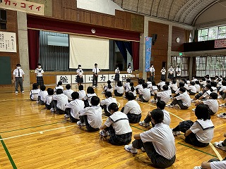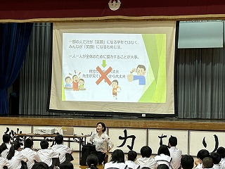 体育館の1年生は、ちょうど正副級長が決意を述べていました。「自分で気づき、考え、行動できるようにしたい」「困っている人がいたら助け、いけない行動には注意できるようにしたい」「みんなが楽しいと思える学年にしたい」など、一人一人がみんなのためにできることを考えてくれていました。