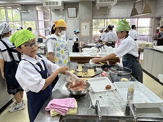 「お腹いっぱいではいらないです~」と言いながら、美味しそうなハンバーグを焼いている4組さん、ぺったんぺったんビニール手袋をした手で上手にハンバーグの形を作っていました。うさぎリンゴの包丁の扱いもぎこちないですが、2人ずつ教室前方で実技テストもあわせて頑張っています。ハンバーグのたねが少し余ると「これはお代わり用!」と言ってミニミニハンバーグを作っているグループも!なんだかとても楽しそうでした!