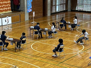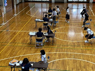 今日は授業と並行して、体育館で全学年視力検査が行われています。