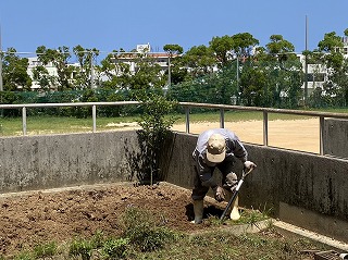 石嶺中環境ボランティアの上江洲さんが、日曜日にステップ1組の花園の整備を行って下さいました。まだまだ暑い日差しが照り付ける中、台風で荒れていた花園を丁寧に整えてくださいました。この後生徒と一緒にきれいなお花の苗を植える予定とのこと。とても楽しみです。