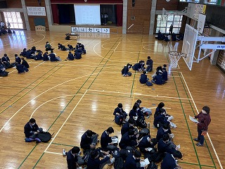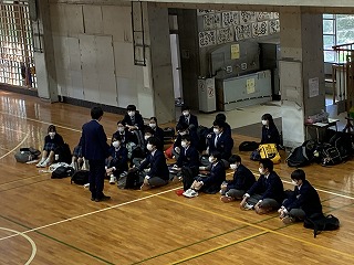 当日受験会場の高校での集合場所確認など、引率の先生との打ち合わせです。その後、学年主任の桃原先生から9日の諸連絡と全員合格に向けて全力で頑張ろうと激励がありました。