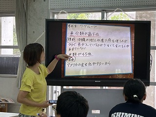 都道府県別の食品接種量を比較した表や、糖尿病や脳内出血の都道府県別死亡率の表をもとに、なぜそうなのか沖縄県の食生活や生活習慣などから理由を考える活動でした。