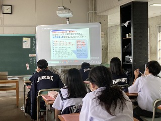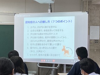 金城さんは放送室からお話をしていただき、1年生は各教室で画面を見ながら、「認知症について」学びました。