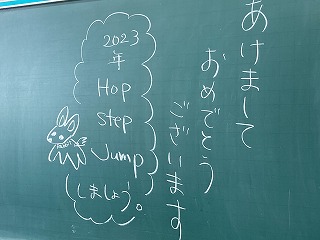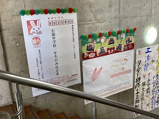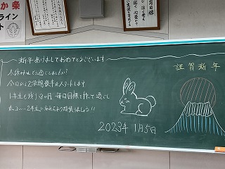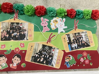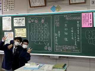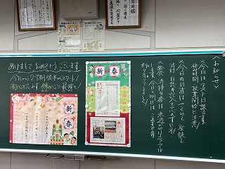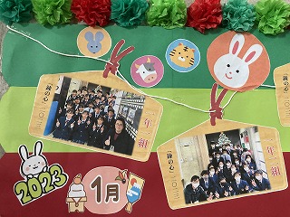 新年の学級の黒板や学年フロアの掲示物も素敵でした。絵馬に「錬の心2023」とあり、気持ちも引き締まります!