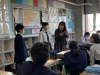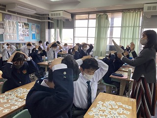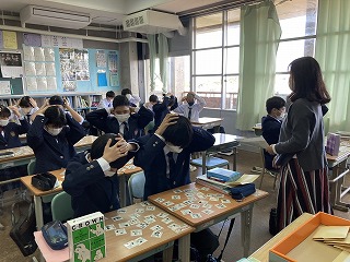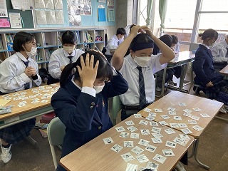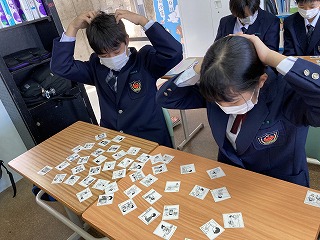 1年生は英語の授業で冬休みの出来事をペアで紹介し合ったり、動詞のカルタとりを行っていました。「go shopping」と読み上げられると、その絵札を見つけるまでみんな両手を頭の上でスタンバイしている姿がなんともかわいらしかったです。