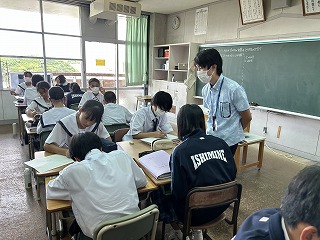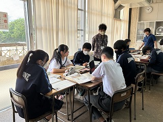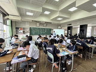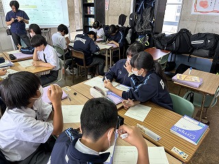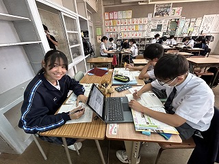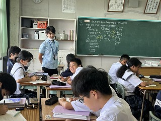 また、4校時は1年2組で祖慶泰斗先生の数学の研究授業が行われました。文字と式の単元で分子が多項式の場合の乗除の計算について、グループになって問題に取り組みました。
