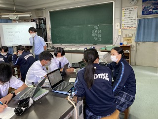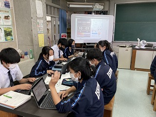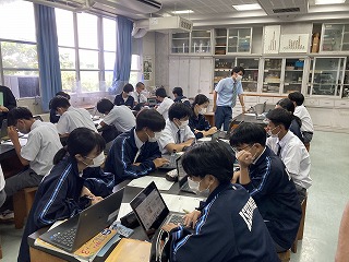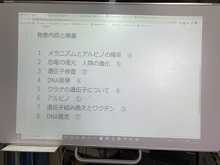 遺伝子やDNAに関する研究成果が、世の中でどのように役立っているのか、それぞれのグループで興味のあるテーマについて調べてプレゼンテーションソフトでまとめる授業でした。
