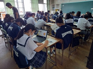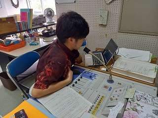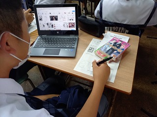 進路主任でキャリア教育担当の長嶺有晃先生が、放送室からグーグルミートをつなぎ、どのように活用したら効果的なのか丁寧に説明をしてくれました。また、真っ白い表紙は、世界でたった一つの自分のダイアリーにするために、美術の授業とリンクさせ、一人ひとりデザインを考えます。いろいろなページを開きながら、残りの時間はデザインを考えたり、週末の予定を書き込んだり、友達の誕生日を記入したり、思い思い使い始めました。登校したらダイアリーを開き、移動教室でも持ち歩き、課題が出たら書き込むなど意識を持って取り組んでいきます。