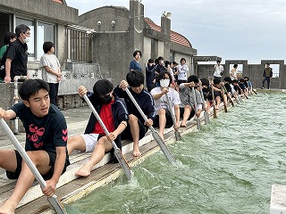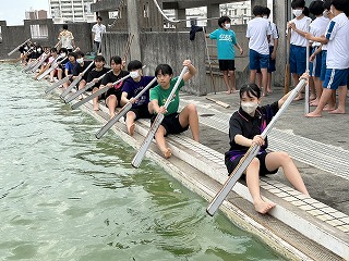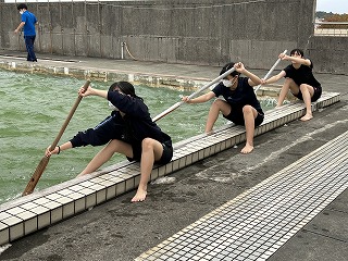 さらに、スタートするときの漕ぐ速さを意識する練習を行いました。「よーい!」の掛け声とともに一漕ぎするタイミングをそろえることも大事です。これまでの経験を生かした教頭先生や達郎先生の指示のもと、日々上達しています。