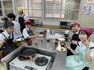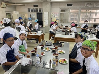 2校時に1年3組の調理実習を参観しました。メニューは鮭のムニエルと卵スープです。作り方をもう一度見直しながら、調味料を量って合わせます。鮭の下ごしらえ、卵スープのとろみをつける水溶き片栗粉の準備などグループで分担していました。エプロン姿の1年生はみんなテキパキと動いていました。準備のできたところからいただきます。感想を聞いてみると「美味しいです!」とうれしそうに答えてくれました。今日の給食はカレーとシャーベットだけどみんな食べられるかな?夏休みはぜひ家でも挑戦して家族にごちそうしてみてはどうでしょう?
