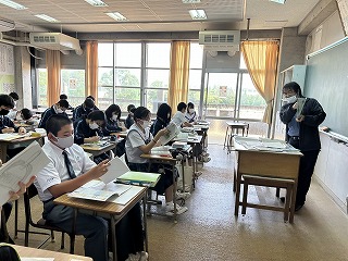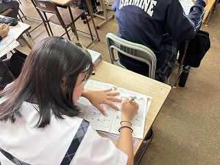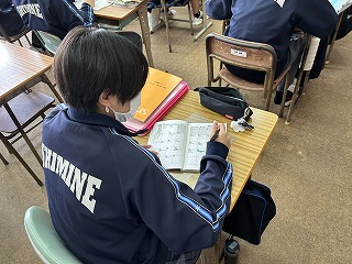 3年5組の国語の授業で、安博先生がダイアリーのマンスリーに課題などを記入するよう促すと、みんながサッと開いて書き込んでいました。提出物や石嶺ドリル、単元テストや検定試験など、いつ何があるか見通しを持って準備できることが大切です。直前になって慌てることのないよう、意識して取り組んでいきたいですね。