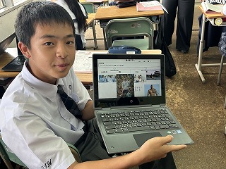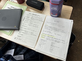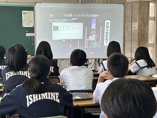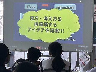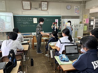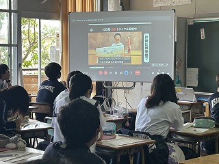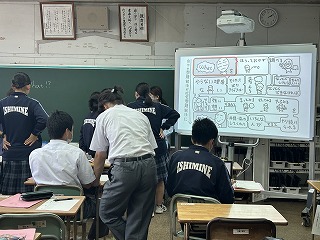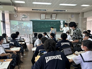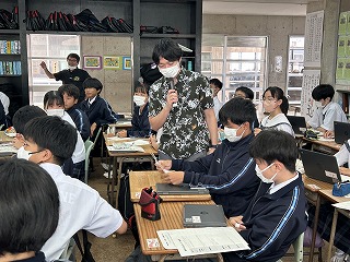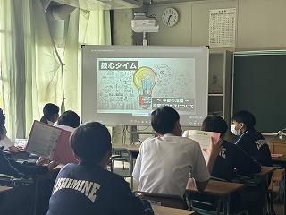 レウォン君のすごいプレゼンに、終わった瞬間目の前にいるかのように生徒の皆さんが拍手をしていました。伝える力ってすごいですね。その後、学年主任の高木先生と仲地先生が今日の探究テーマの設定の方法について、説明をしてくださいました。