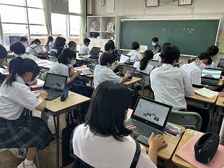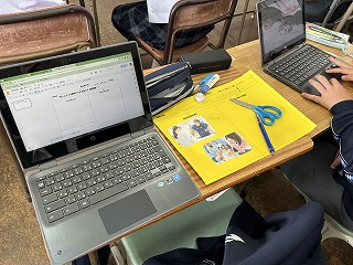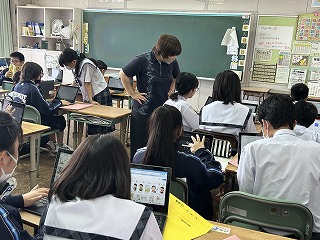 2学年では和繁先生がインタビュアー、由紀先生がカメラマンになって「突撃あなたの探究テーマは何?」を各学級に映し出します。「サンゴの石灰化と海のゴミ問題」など、それぞれのテーマについて深掘りするためにインタビューしていきました。「沖縄の代表的な郷土料理」について調べたいという生徒のワークシートを見せてもらいました。ちょっとした疑問として「琉球料理」と「沖縄料理」の違いについても着目していました。